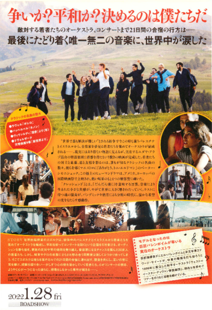 世界的指揮者のスポルクは、紛争中のパレスチナとイスラエルから若者たちを集めてオーケストラを編成し、平和を祈ってコンサートを開くという企画を引き受ける。オーディションを勝ち抜き、家族の反対や軍の検問を乗り越え、音楽家になるチャンスを掴んだ20余人の若者たち。しかし、戦車やテロの攻撃にさらされ憎み合う両陣営は激しくぶつかり合ってしまう。そこでスポルクは彼らを南チロルでの21日間の合宿に連れ出す。寝食を共にし、互いの音に耳を傾け、経験を語り合い…少しずつ心の壁を溶かしていく若者たち。だがコンサートの前日、ようやく心が一つになった彼らに、想像もしなかった事件が起きる――。