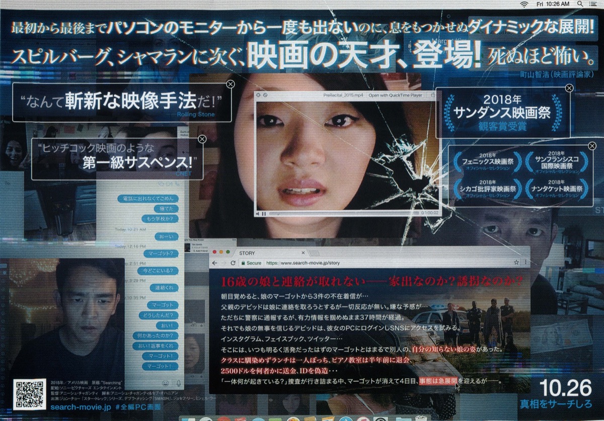 私は観ていませんが、パソコンの中でのストーリー展開は過去に同様の映画があったとのこと。過去作はともかく、本作ではこのアイディアは秀逸でした。